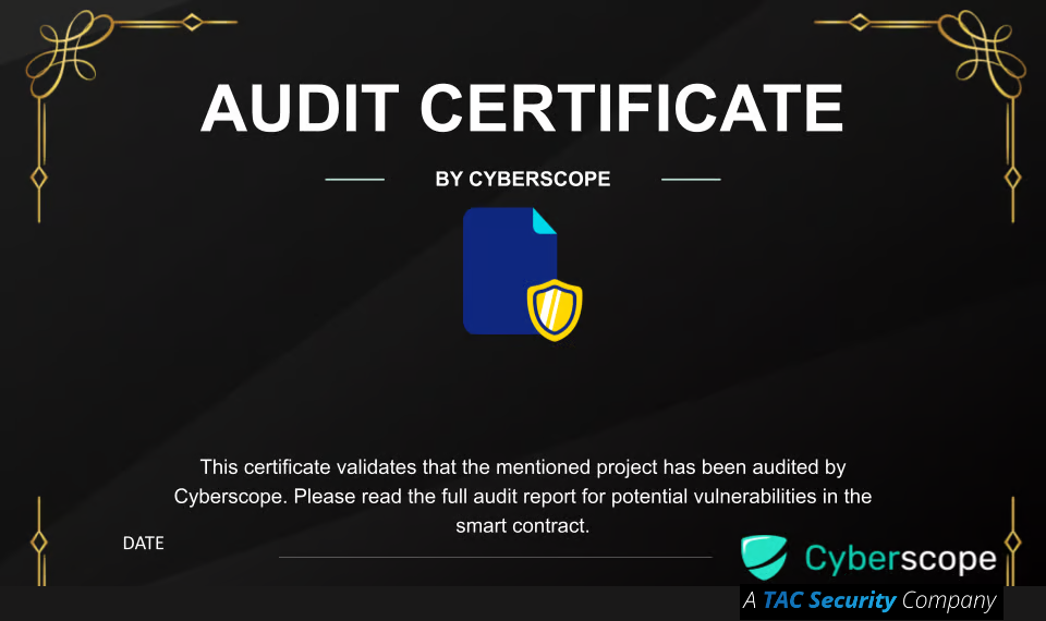 <figure><img src="https://662180148-files.gitbook.io/~/files/v0/b/gitbook-x-prod.appspot.com/o/spaces%2FqxIAKt2dRjDYEHgkqG8s%2Fuploads%2FTTdkcH90EKpMmoWemr3C%2Faudit.png?alt=media&#x26;token=3ad629dc-b202-45f4-9b89-43e0ef31b98e" alt=""><figcaption><p>Cyberscope's Audit Certificate</p></figcaption></figure>