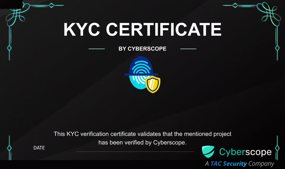 <figure><img src="https://662180148-files.gitbook.io/~/files/v0/b/gitbook-x-prod.appspot.com/o/spaces%2FqxIAKt2dRjDYEHgkqG8s%2Fuploads%2FjsrIxyIVNhNsedoSiiQX%2Fkyc.png?alt=media&#x26;token=93cd787c-8667-45fc-8311-1b77e6033ef9" alt=""><figcaption><p>Cyberscope's KYC Certificate</p></figcaption></figure>